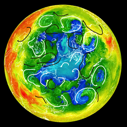 50, 500 hPa 面天気図では,白が左回転の流れ,黒が右回転の流れ