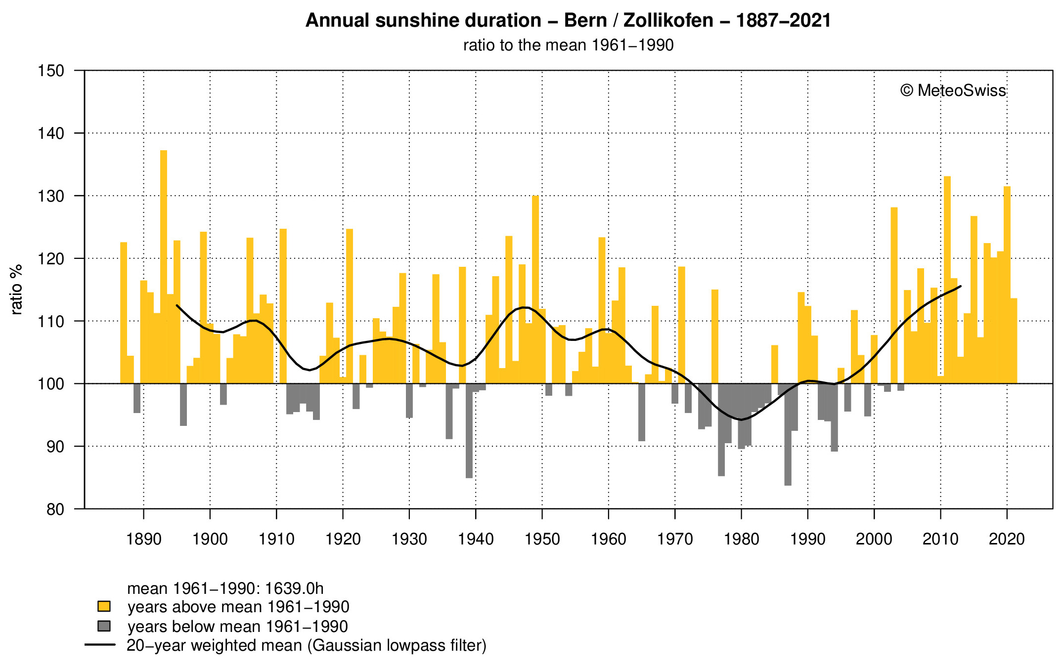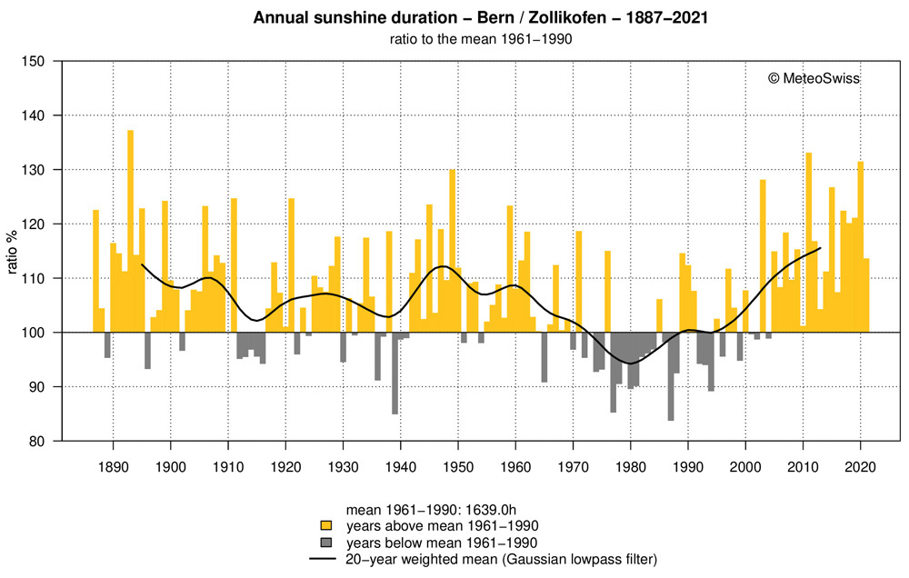 ひとはこれを見て,「温暖化」の思いを改めて強くすることになる。 メディアもひとも,「温暖化」の内容に思考停止し,そして「暖かい → 雪が降らない」だと想っているからである。 事実は:《雪が降らないのは,雪を降らせる雲ができないから》 スイスは,つぎのグラフが示すように,1995年頃から日照時間が増えており,降雪量の減少はこれと対応している。 ── 逆に, 1980年の前後は日照時間が少ないので,降雪量の多かったことが推測される。 |