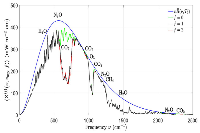 青と黒の曲線で囲まれた領域 = 温室効果ガスに吸収される地球放射熱 |