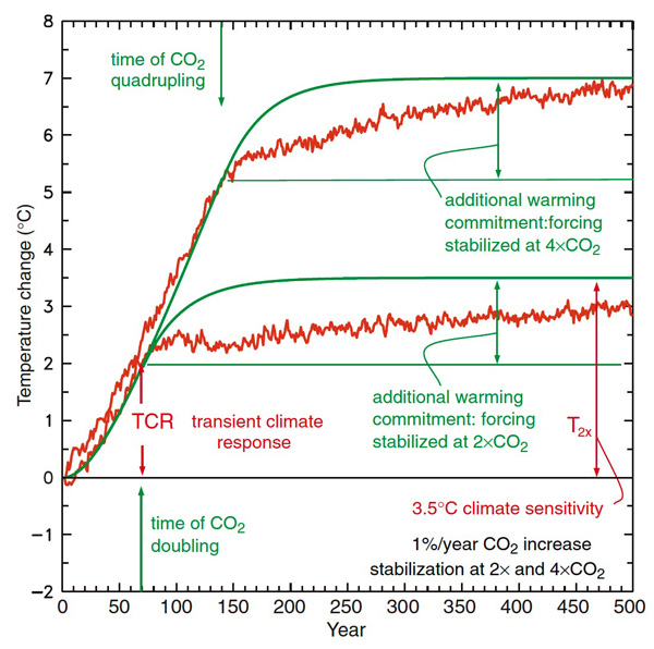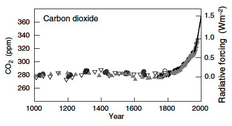 「同じふうに」と思うのは,ひとの習性である。 デマゴギーのツボは,ひとのこの習性につけ入ることである。 CO2 排出量の増加を比例関数的に見せれば,ひとは勝手に,CO2 濃度が比例関数的に上昇し,気温が比例関数的に上昇すると思う。 CO2 排出量の増加を指数関数的増加に見せれば,CO2 濃度・気温も指数関数的に上昇すると思う。 つぎの IPCC の報告は,この手のデマゴギー: |