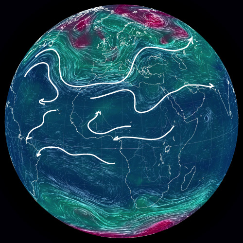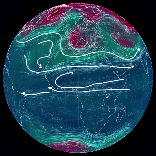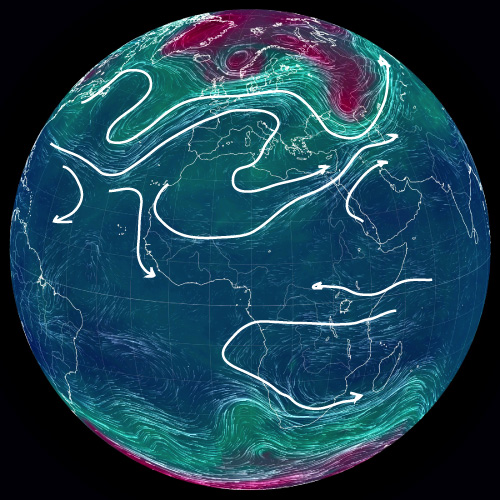 ── 大気の流れを,白の矢線で示す