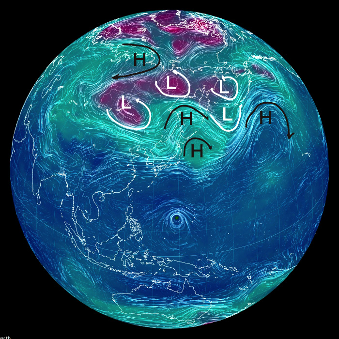 天気の状況は大気の状況であり,そして大気の大局的状況は 500 hPa 面天気図においてよく示されるからである。 そしてその天気図は,earth.nullschool.net の風・気温天気図がよい。 気圧天気図 (等高度線で気圧を表現) は,特に必要としない。 気圧の布置は,風・気温天気図から分かるからである。 即ち,つぎが成り立つ ( 日々の天気を大局的に理解する法):