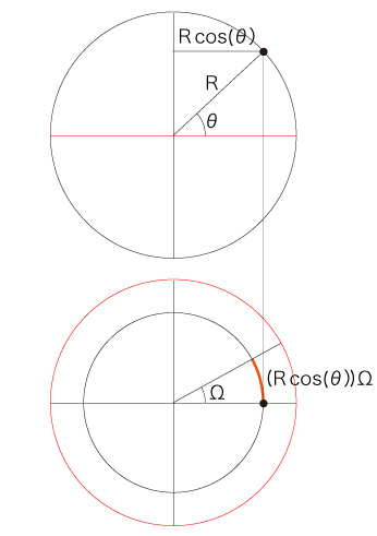 地球の半径を \( R \) (m),角速度を \( \Omega \) (ラジアン/秒) とすると,緯度 \( \theta \) (ラジアン) の地点の回転速度 \( v \) (m/秒) は,