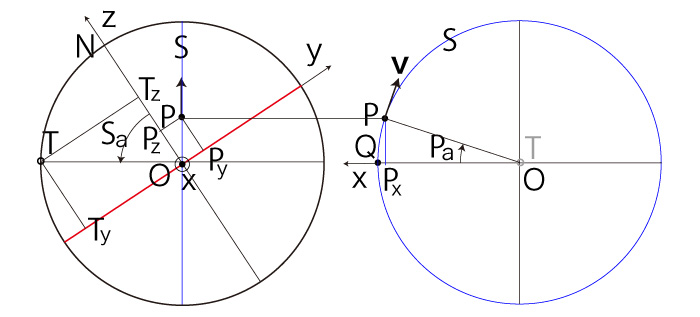 ここでは,\( P,\ \bf{v} \) の座標を表現するためのパラメータ \( (S_a, P_a ) \) を導入する。 \( (P, \bf{v} ) \)-法点を \( T \) とする。 そして,回転角度 \( S_a,\ P_a \) をつぎのように定義する:
