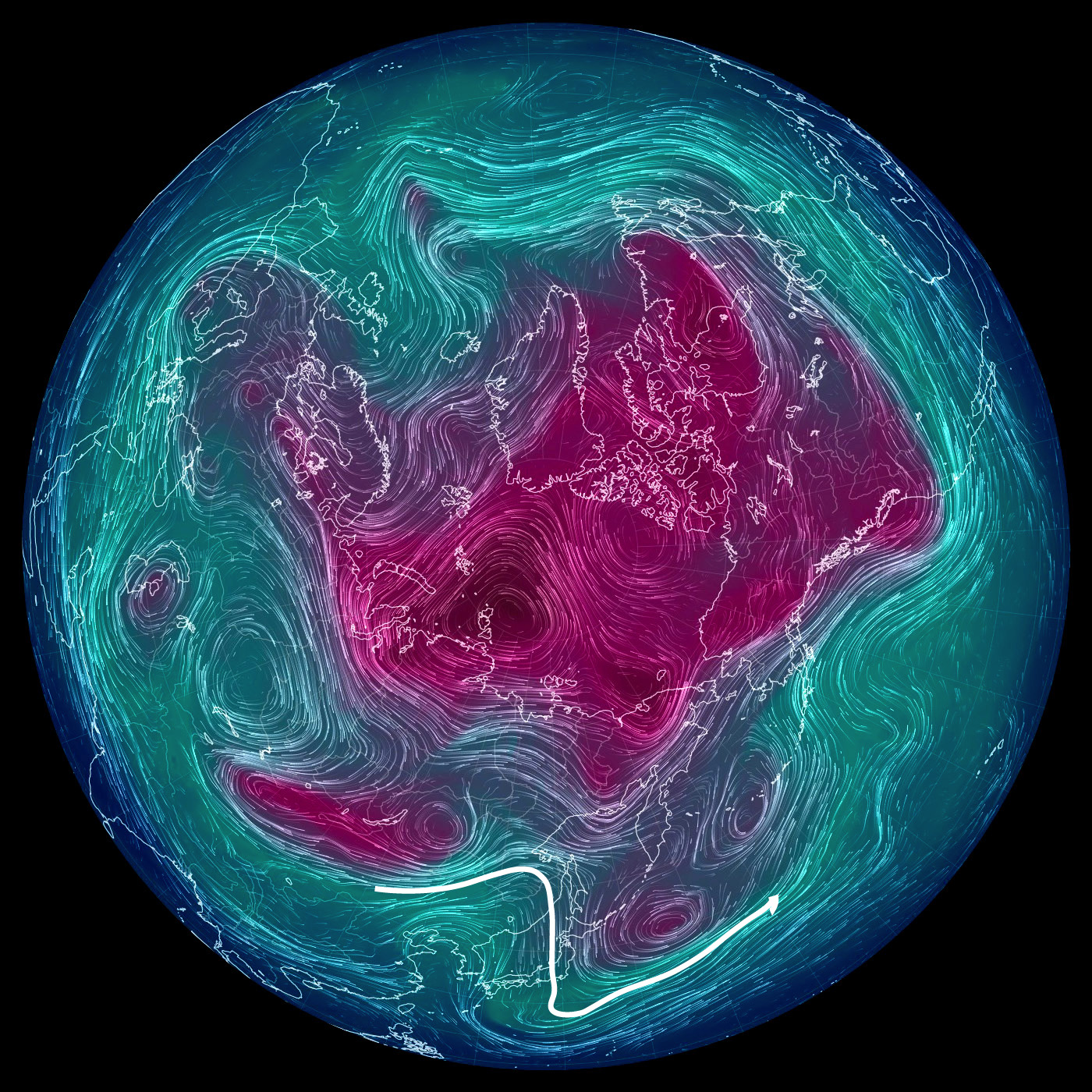 東京を通過する風を,白で表示。 |