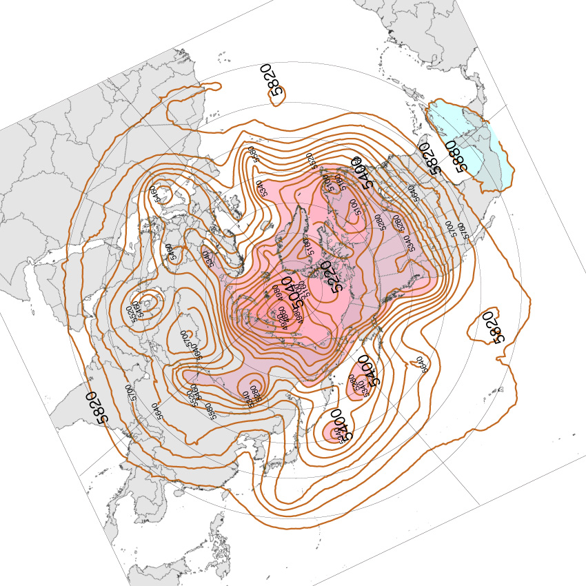 「寒いところから流れてくる風か,それとも暖かいところから流れてくる風か」は,地上天気図からはわからない。 風の流れは,地勢によって大きく攪乱されるからである。 そこで,風の大局的な流れをとらえるために,高層天気図を用いる。 高層天気図は,日本の「気温が日々変化するしくみ」を見ようとするときは,北極中心の北半球 500hPa 面天気図を用いることになる。 以下「高層天気図」と言うときは,これを指す。 地上天気図には等圧線 (等気圧線) が書かれている。 「気圧」とは何か。 空気粒子の密度──濃い・薄い──である。 地上天気図と高層天気図の大きな違いは,「等圧線」に代わって「等高度線」になっていることである。 500hPa 高層天気図だと,「この地点は,上空 ○m が 500hPa」を観測し,その高度が同じになる地点を線でつなげる。 これが「等高度線」である。