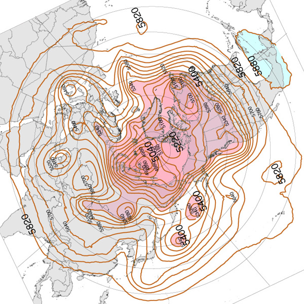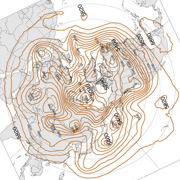 こうして,その等高度線からは,つぎの3つが同時に読めることになる: 実際,北半球 500 hPa 面天気図は,つぎのようになる: