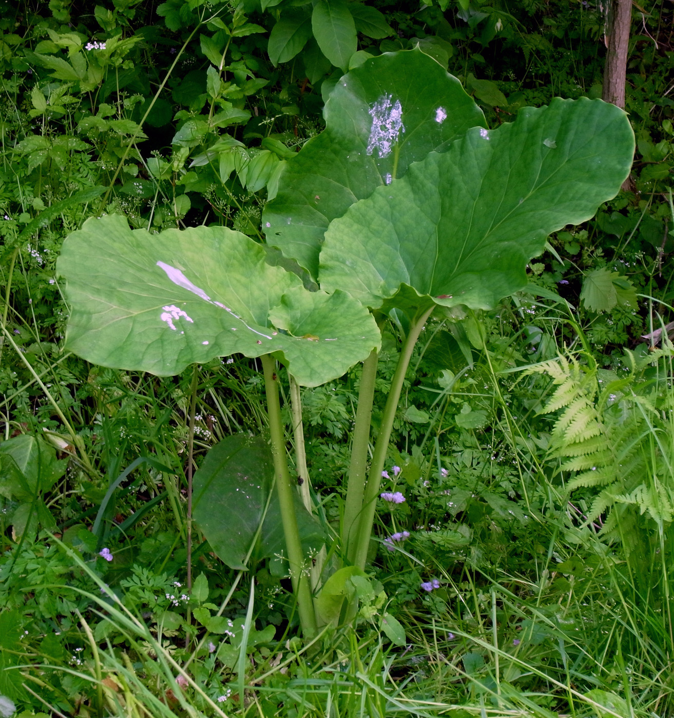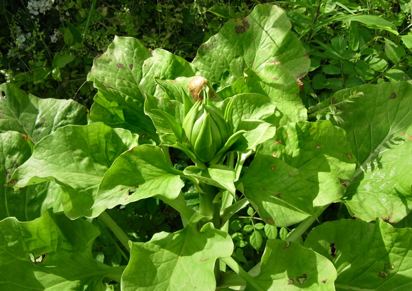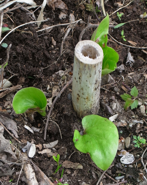 このオオウバユリの真上には電線があり,カラスがよくとまる。 昨年は,カラスの糞害もあって,夏までには萎えてしまい,無くなった。 しかし今年も,葉が出てきた。 |