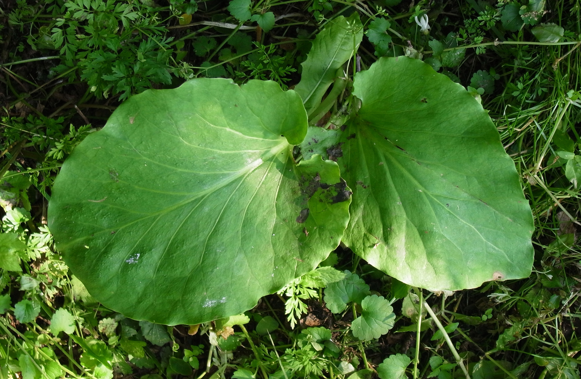 昨年は葉が大きくならず,そして萎え,しまいに無くなった。 しかし今年も葉が出ていた──他の草の蔭でつぎの大きさに成長していた(周りの草を刈って,見えるようにした)。 |